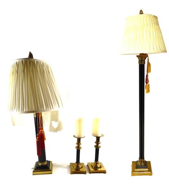 floor lamp with Corinthian columnar four-lobed ebonized standard on beveled square base, pleated and bunched cream-colored conical shade, red and gold tasseled cords, pierced anthemion finial, 61" h.; table lamp with Ionic solid ebonized columnar sta