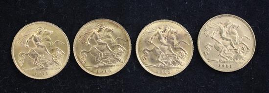 Four George V gold half sovereigns, two 1911, EF and VF, 1913, EF and 1915