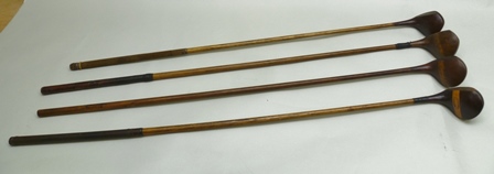 FOUR HICKORY SHAFTED WOODEN-HEADED GOLF DRIVERS