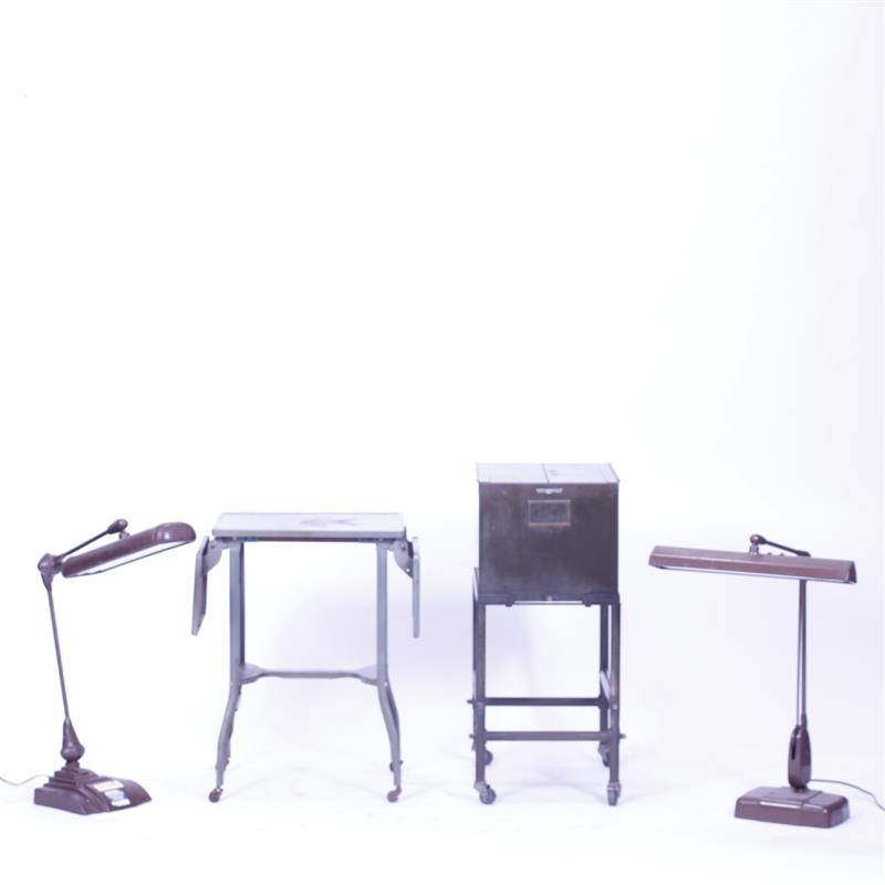 two metal desk lamps, 1 rolling metal filing cabinet, & rolling metal drop leaf clerk table