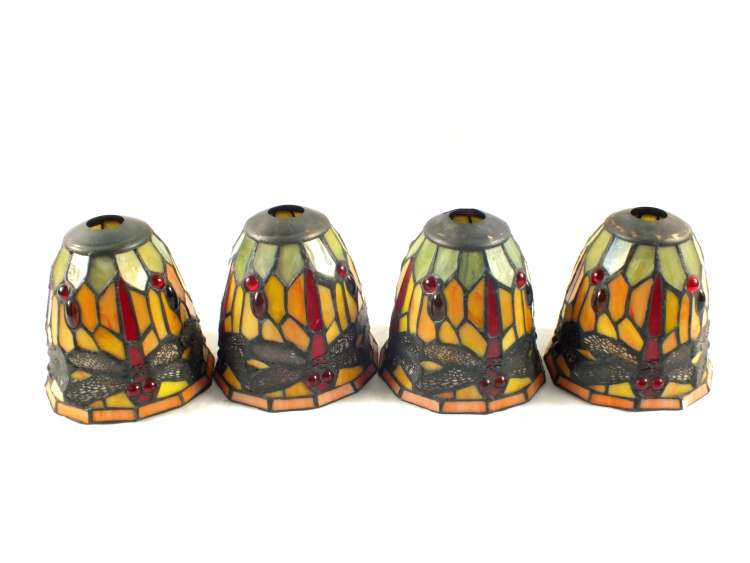 Four Tiffany style stained glass lamp shades decorated with dragonflies