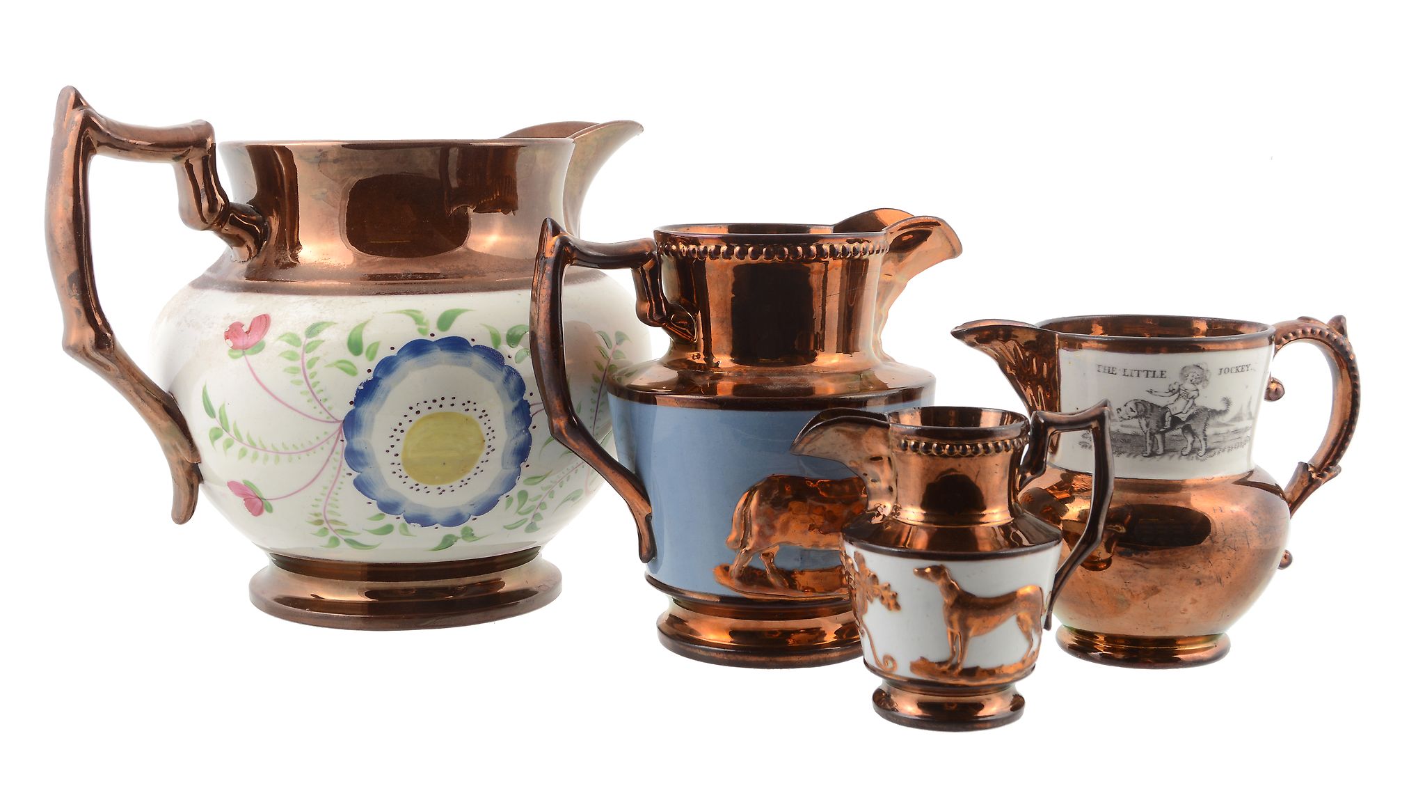 Four various British pottery copper-lustre jugs