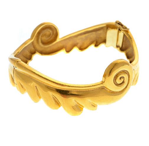 The 20k, 18k yellow gold hinged bangle bracelet measuring approximately 16.5 mm in width and featuring a ruffled, swirl motif, completed by an 18k yellow gold pressure lock and figure eight safety. {Gross Weight: 42.6 dwts}