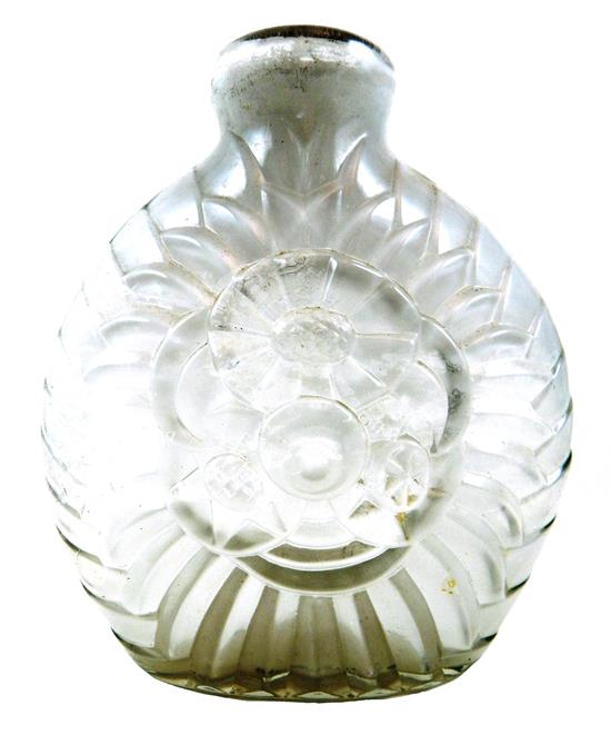 stylized palm frond relief surrounding flowers at center, signed "F.B.G.(?), France" in tripart circle resembling peace symbol underside base, possibly sick glass and extremely cloudy, 11 5/8" h.