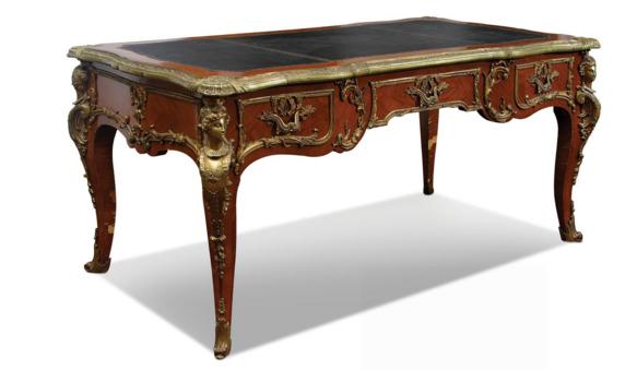 Tooled inset leather writing surface surrounded by ormolu mounts above ornamented apron raised on four cabriole legs with brass caryatid mounts terminating in cast feet