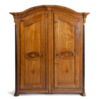 Friborg-style walnut wardrobe with a gendarme hat and 2 black half-columns in the Empire style, each door is decorated with two oval medallions with central inlay of a flattened round divided into slices of cake, the upper part of the door is decorat