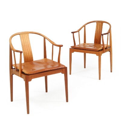 “China chair”. A pair of mahogany armchairs. Seat cushion upholstered with button fitted patinated brown leather. Model 4283. Designed 1944. Manufactured by Fritz Hansen, 1988. (2)