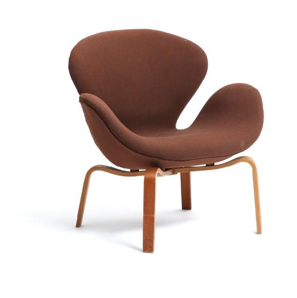 "The Swan". Easy chair with laminated moulded teak frame, seat upholstered with brown wool. Model 4325. Designed 1960. This example manufactured 1960s by Fritz Hansen. Literature: Carsten Thau and Kjeld Vindum: "Jacobsen", referred to and ill. pp. 46