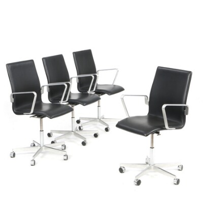 Set of four office chairs with castors and base og aluminium. Upholstered with black leather.