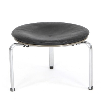 “PK 33”. Stool with three legged frame of brushed steel. Seat upholstered with black button fitted leather. Designed 1959. Manufactured and marked by Fritz Hansen. H. 35 cm.