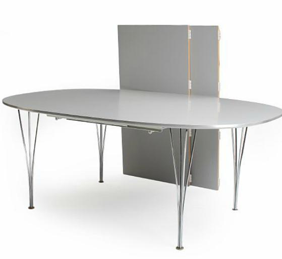"Super Elliptical". Extension table with two leaves, grey laminate top with aluminium rim