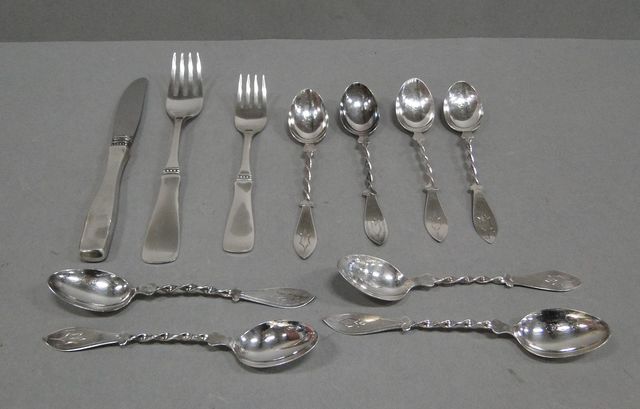 GAB, 8st teskedar, silver, total vikt 104g samt 3st bestick, Uppsala, silver, total vikt exklusive kniv 76g