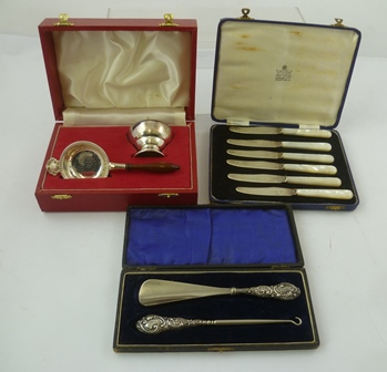 GARRARD & CO. LTD., A SET OF SIX SILVER BLADED MOTHER-OF-PEARL HANDLED TEA KNIVES, Sheffield 1960, cased, together with a cased silver handled SHOE HORN AND BUTTON HOOK, and a cased silver plated TEA STRAINER with turned wood handle