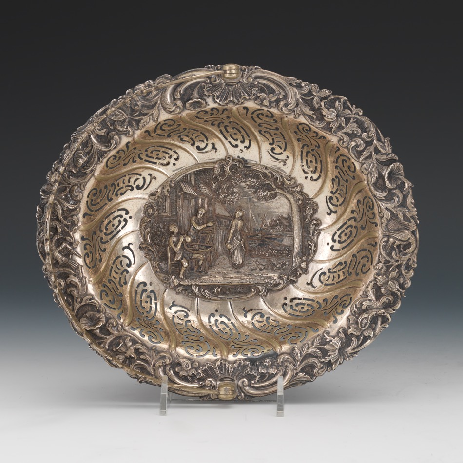 Dutch Gebroeders S & H Reitsma Repousse Silver Bowl, Leeuwarden, Early 20th Century 7 ½" x 8 ¾" x 7" extended handle 833 Dutch silver repousse bowl with pierced sides, foliate rim, bottom depicting a typical Dutch figural genre scene by brothers Stev