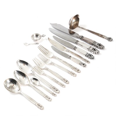 “Acorn”. Sterling silver cutlery. Manufactured by Georg Jensen, 1915–1951. Weight excl. parts with steel app. 1960 gr. (59) Comprising: 4 dinner knives, 4 dinner forks, 4 dinner spoons, 6 luncheon knives, 8 luncheon forks, 6 dessert spoons, 3 pastry