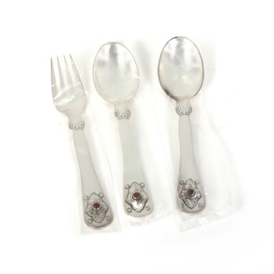Two anniversary dessert spoons and one dessert fork of sterling silver