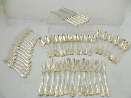 GEORGE ANGEL, HENRY WILKINSON & OTHERS A MATCHED SUITE OF FIDDLE, THREAD AND SHELL PATTERN FLATWARE AND CUTLERY, comprising 12 x dessert spoons variously monogrammed (757g.), 6 x tablespoons (615g.), 6 x table knives with stainless steel blades, 13x