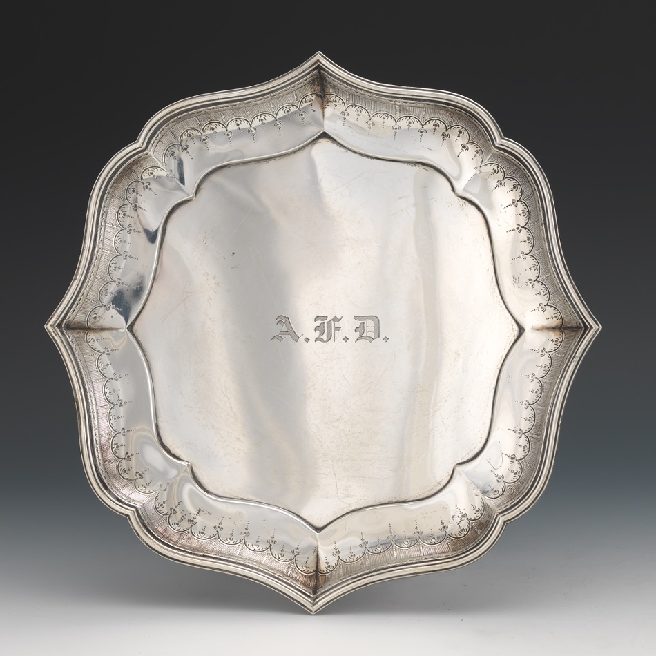 George III Reproduction Sterling Silver Tazza by Marcus & Co., New York 10 ½" x 10 ½" x 3 ½" Quatrefoil shape shallow bowl with solid cast rim, hand chased bell flower and swag design on the inside, on tapered foot and ribbed stem, monogrammed in the