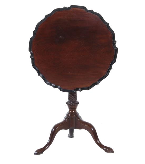 Georgian mahogany tilt-top piecrust table circa 1820, scalloped top, twist-turned pedestal, S-curve legs with slipper feet; H27 1/2" Dia.24 3/4"