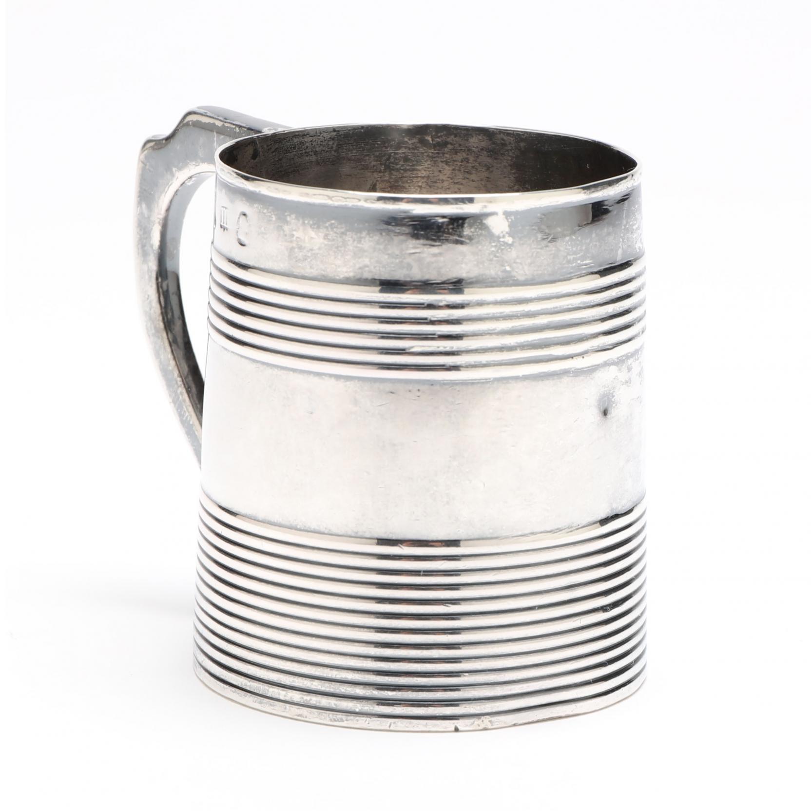 London (1827) hallmark, sponsor's mark "WB" in rectangular punch (possibly that of William Bateman II, great-grandson of Hester Bateman), tapered cylindrical form with reeded decoration. Size 2.5 in. Weight 3.1 troy oz