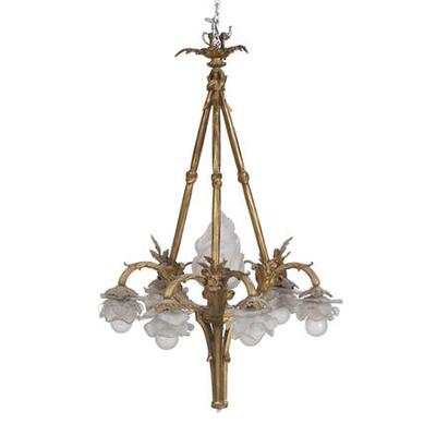 Gilt bronze chandelier decorated with leaves and ribbons, seven fires and glass tulips representing petals of flowers.