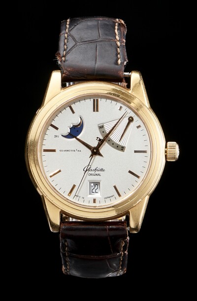 Silver dial, gold stick hands and hour markers, Moon phases, power reserve, date window at 6 o'clock, transparent backdrop, 750 gold, 38 mm D, 118 g gross weight, with certificate of authenticity