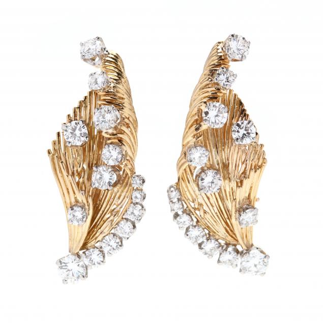 Finely designed in a leaf motif and each prong set with (14) full cut round diamonds graduating in size and weighing approximately 3.69 total carats for the pair (H-I color, SI clarity), completed with posts and omega clip backs, testing 18KT. 1.5 i