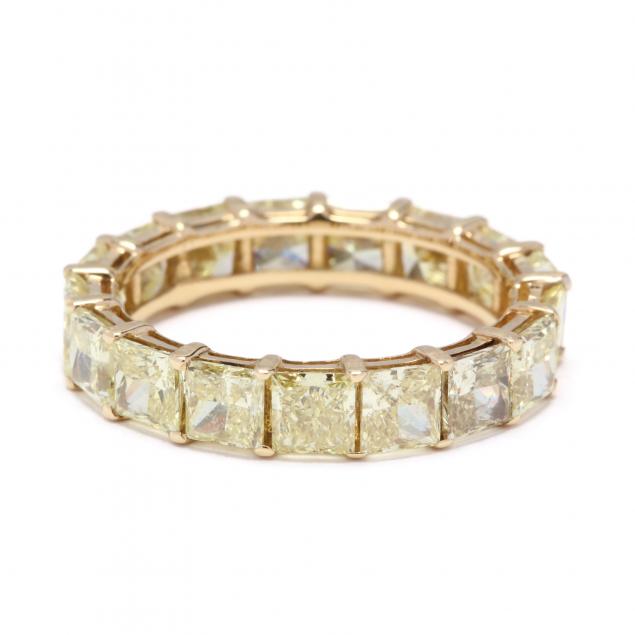 The yellow gold band with (17) prong set fancy yellow princess cut diamonds weighing approximately 4.76 total carats (VS-SI clarity), testing 18KT. 4.25mm; Ring size 6.75 1.9 dwt.