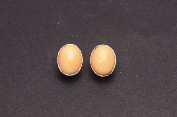 White gold earrings 18 K with oval cabochon coral pink. Close omega