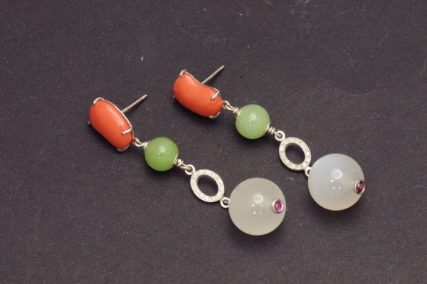 And ruby earrings 18K white gold with coral, jade, bright, adularia. Snap fastener.