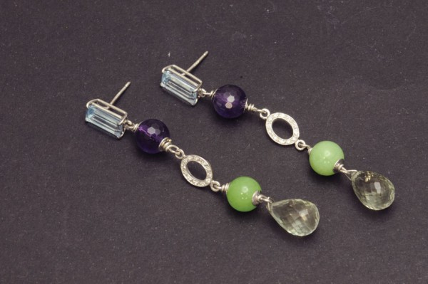 White gold earrings 18 K with knob aqua, blue topaz, amethyst, jade and diamonds. Snap fastener.