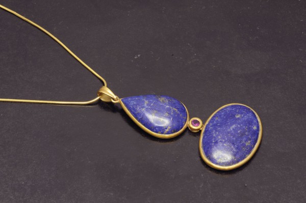 Gold pendant with lapis lazuli and tourmaline