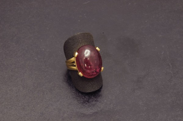 Yellow gold ring 18 K with large cabochon rubellite tourmaline