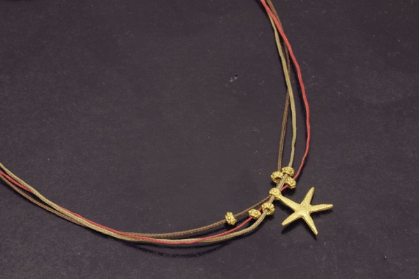 Yellow gold pendant made star-shaped. Tricolor cord with gold pieces and closing.