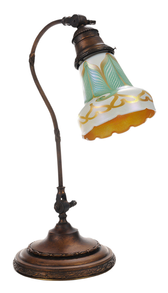 bronzed metal lamp with adjustable post, base with weighted steel bottom, fitted with a fine Quezal feathered scalloped glass shade with gilt border, signed at top rim "Quezal"