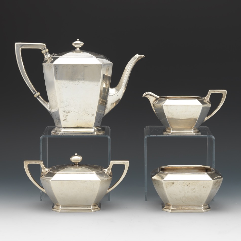 Gorham Durgin Sterling Silver Four-Piece Coffee Set Rectangular tapered form with canted corners, angled handle, on corresponding shaped foot, including: coffee pot with hinged domed lid with baluster finial, bone insulators, swan shape pronounced sp