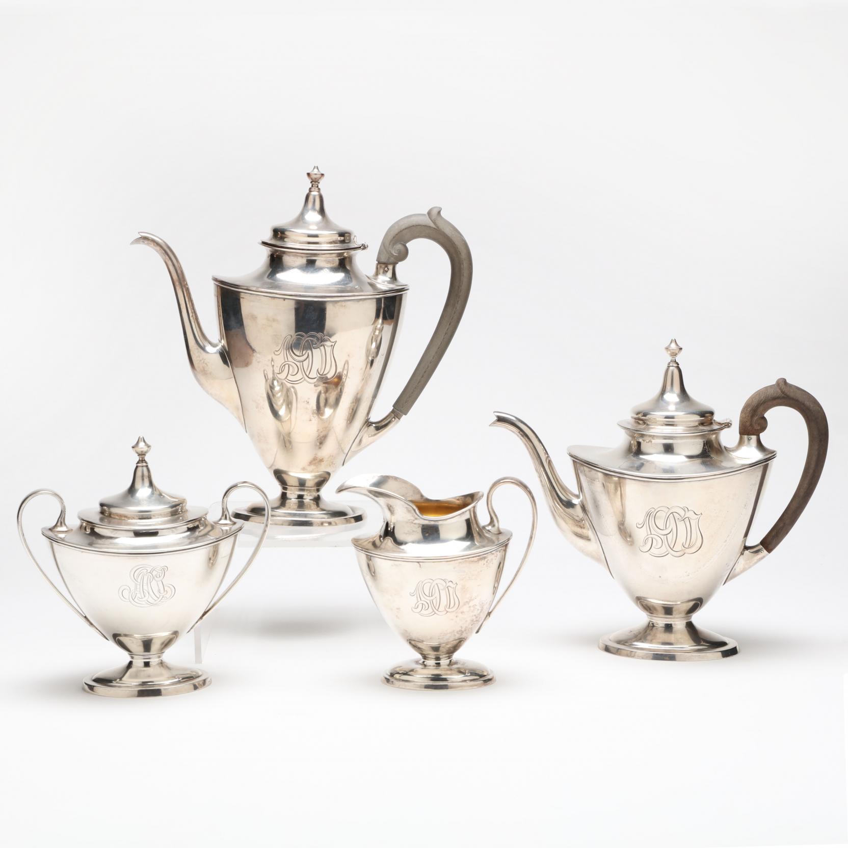 the four piece set including a coffee pot (9.75 in.), teapot, sugar bowl with cover and parcel gilt creamer. Each with period engraved monogram, 1900 and 1901 date symbols, pattern number 13360. Weight 57.65 total troy oz.