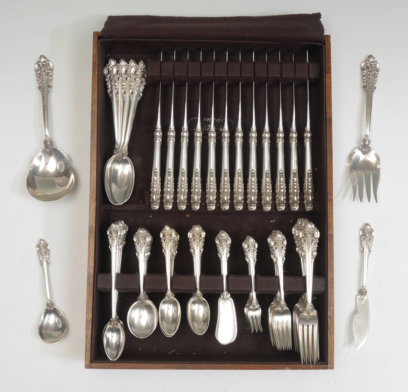 Nearly complete service for 12 approx. 115 pieces in the Grand Baroque pattern by Wallace to include 12 dinner forks (8''), 12 salad forks (6 5/8''), 24 teaspoons (6 1/4''), 12 soup spoons (6 1/8''), 12 iced tea spoons (7 5/8''), 12 hollow knives (9