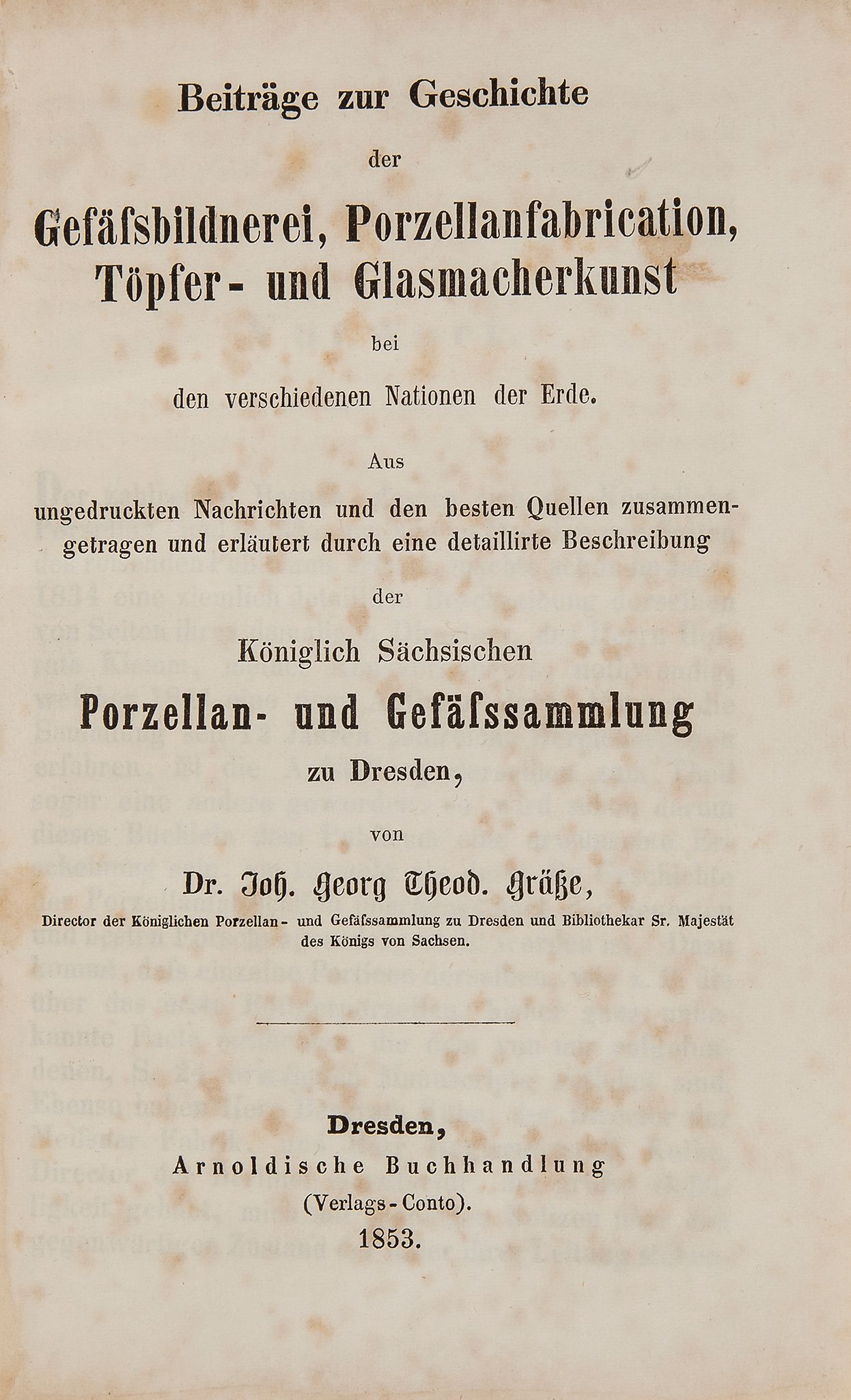 (Dr. J.G.T.) Beiträge zur Geschichte der Gefässbildnerei, Porzellanfabrication, Töpfer- und Glasmacherkunst… der Königlich Sächsischen Porzellan- und Gefässammlung zu Dresden, spotted, contemporary half morocco, rubbed, [Solon p.180], Dresden, 1853 §