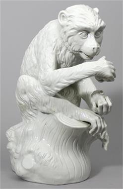 Weiß. Kleinere Glasurfehler bzw. Brandrisse, 1 Vorderzeh des re. Hinterfußes fehlend. Auf naturalistischem Baumstumpf Radmarke in Unterglasurblau, wohl Samson, 19. Jh. H. 45 cm.