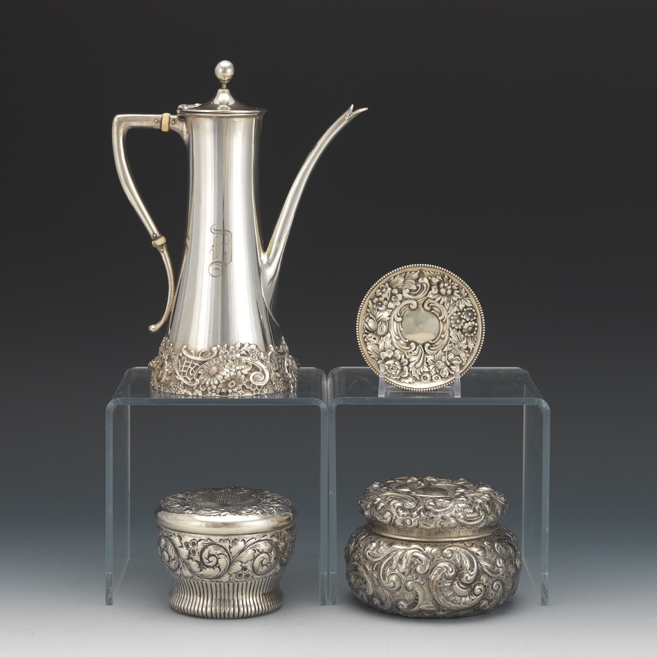 Group of Four; Sterling Silver Rococo Style Coffee Pot, Two Lidded Waste Bowls and Sweet Meat Dish, by Gorham, Redlich, Theodore B. Starr and Dominick and Haff Four pieces with repousse foliate and scroll design including: Ridlich coffee pot of taper