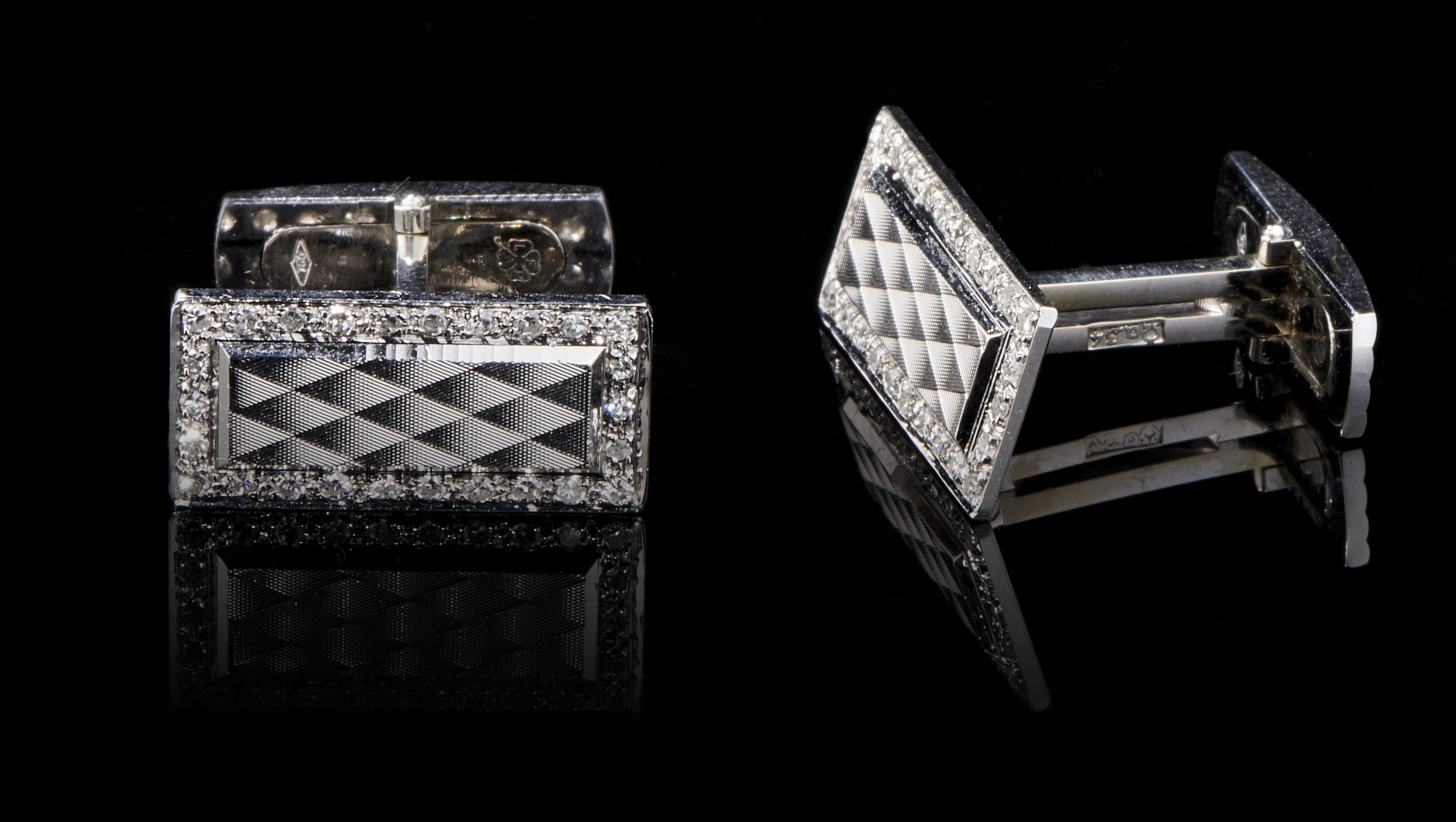Guilloche rectangular cufflinks surrounded by diamonds 750 gray gold, 10x20 mm, 13 g