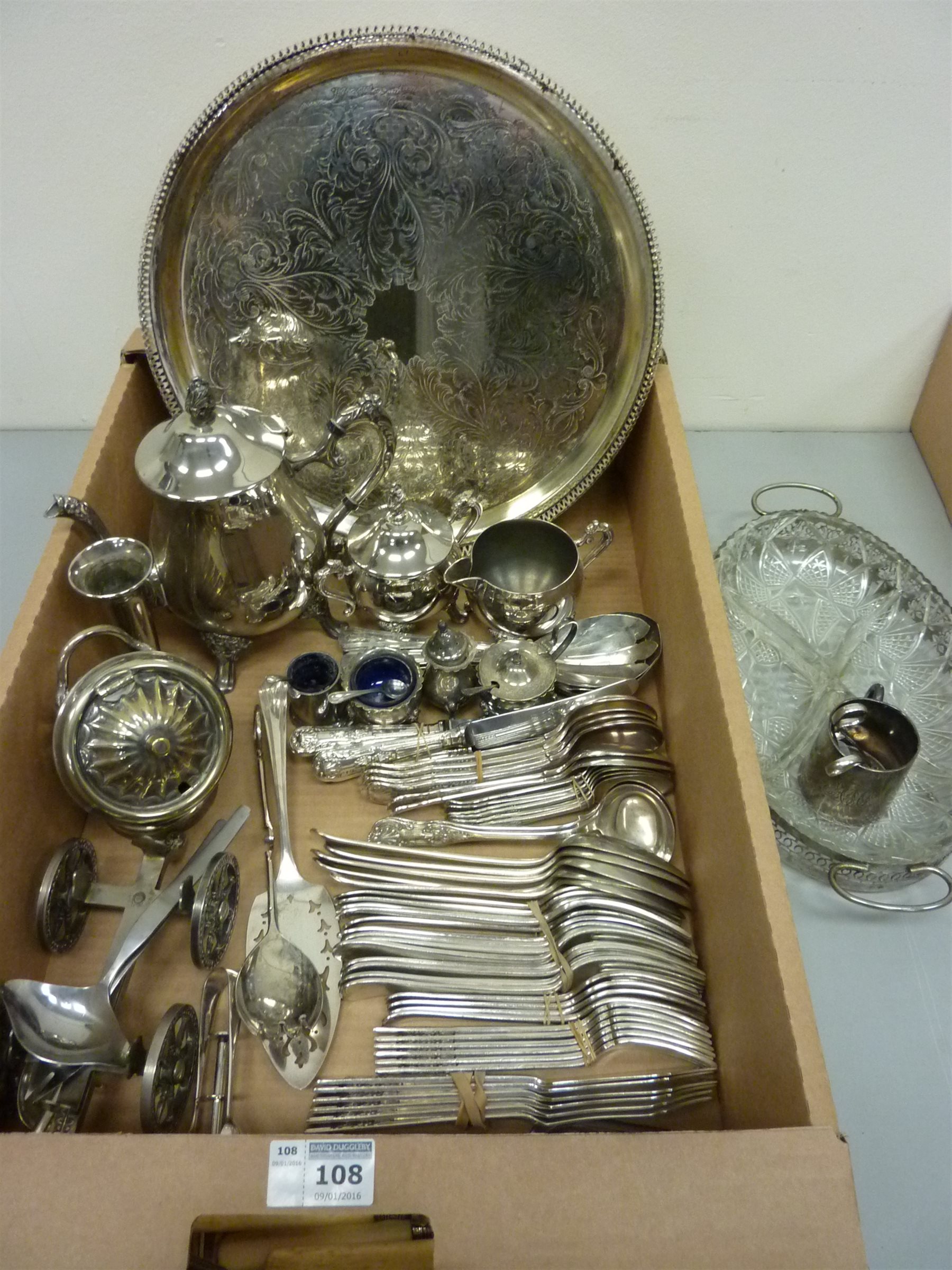 Hallmarked silver beaker, baby's spoon and pusher, silver-plated cutlery and other silver plate in one box