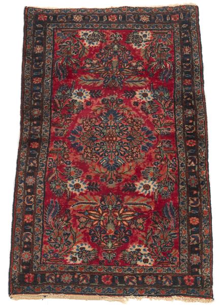 4'3" x 2'6" Wool on cotton weft, primarily red field, flower motif, blackish navy border