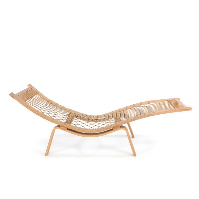 Oak chaise longue with original flag halyard, assembled with brass fittings.
