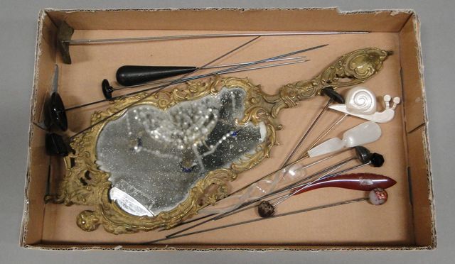 Hand Mirror, Gilt 1800s, L33cm, glass shattering and party hat pins