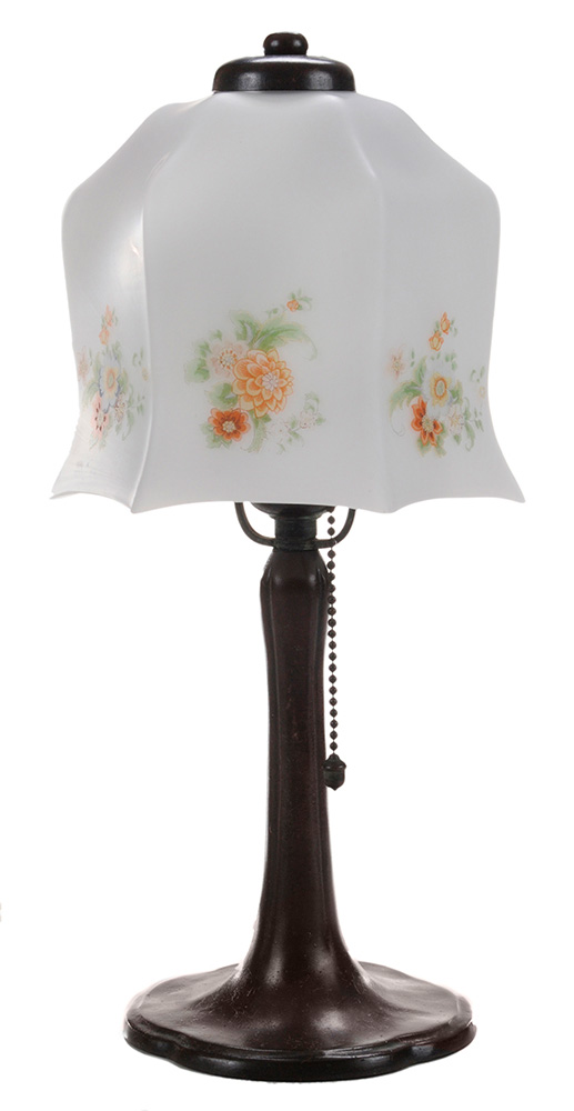 petal-form base with original patina and pull chain, base signed "Handel", hexagonal white transfer-decorated glass shade with copper cap, electrified
