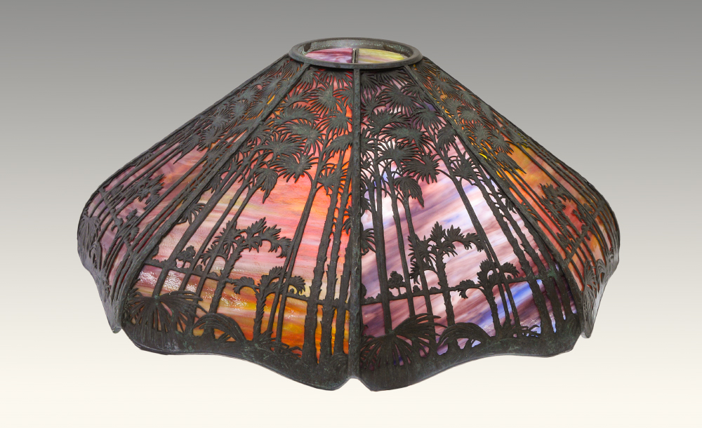 Filigree tropical motif frame with palm trees. 8 vibrant slag glass bent panels, marked Handel inside with impressed mark on frame
