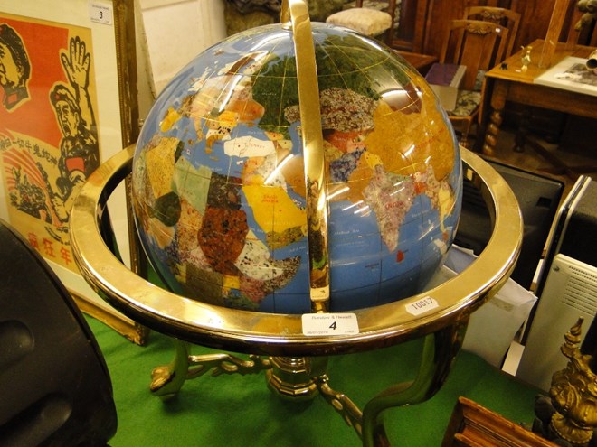 Hardstone inlaid terrestrial table top globe in brass gimballed stand, with compass.