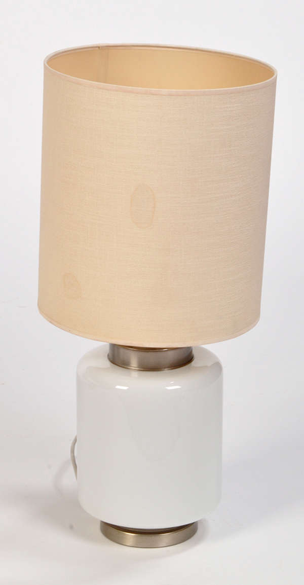 An opaque glass table lamp fitted chrome metal mounts and material shade
